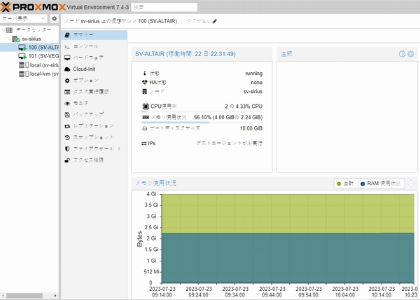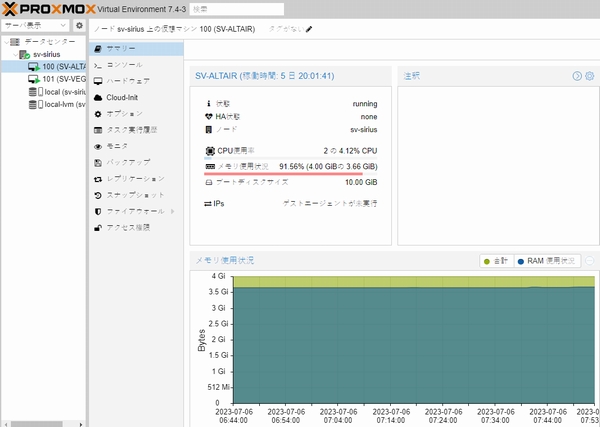 Ploxmox上の仮想マシンで、メモリ4GBで90%以上の使用率になっていました。